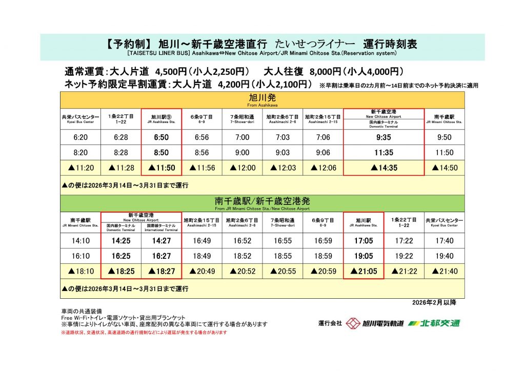 新着情報 新着情報 2026年2月13日 お知らせ たいせつライナー3月の繁忙期運行実施について 旭川~新千歳空港・南千歳駅を直行で結ぶ予約制都市間バス「たいせつライナー」につきまして、3月の繁忙期便運行を3/14~3/31の期間実施いたします。ご予約は2月13日より受付開始!どうぞご利用ください。