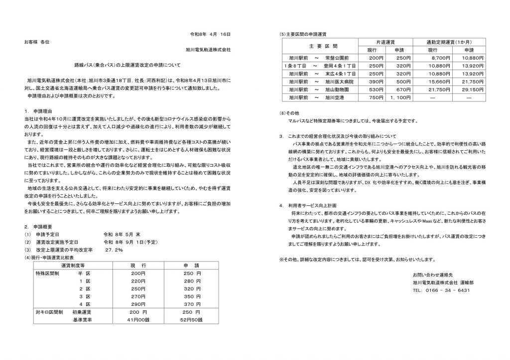 新着情報 新着情報 2026年4月16日 お知らせ 路線バス(乗合バス)の上限運賃改定の申請について 当社は令和8年4月13日旭川市に対し、国土交通省北海道運輸局へ乗合バス運賃の変更認可申請を行う事について通知致しました。